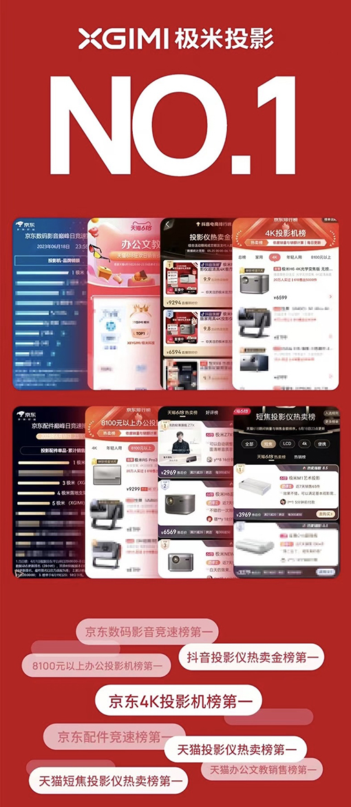 值得一提的是,極米還在此次618中奪得京東數(shù)碼影音競(jìng)速榜第一、京東4K投影機(jī)榜第一、京東配件競(jìng)速榜第一、京東8100元以上辦公投影機(jī)榜第一、天貓投影儀熱賣(mài)榜第一、天貓辦公文教銷(xiāo)售榜第一、天貓短焦投影儀熱賣(mài)榜第一和抖音投影儀熱賣(mài)金榜第一等多個(gè)榜單冠軍。