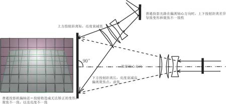 傳統的長焦投影為正軸投影,即投影機的位置必須放置在屏幕的軸心方向上,否則,由于投影到屏幕上下邊距離的差異,會導致亮度、聚焦、形狀以及色散等各方面的差異,無法獲得均勻一致的影像。然而,投影機放置在軸心方向時,又會導致使用者的不便,比如演講者的陰影會投射在屏幕上,或演講者的眼睛會受到投影機強光傷害,等等。一些廠家為了提供近距離大畫面投影采用了廣角鏡頭,但普通廣角鏡頭在獲得較大畫面的同時,在以上幾個指標上反而使畫面質量下降。