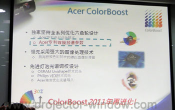 技術細節上,宏碁重點提到了色彩和防塵兩個方面。宏碁獨有的躍彩技術(ColorBoost)已經完善發展到第四代,優化的六色輪設計和打造,結合頻譜增益技術使得色域可以比前一代的躍彩技術再實現30%的提升。此外,色彩矯正、動態解析、噪聲消除等圖像處理能力也得到很大提升。同時結合第二代的色彩保真技術(ColorSafe)保證DLP投影機長期使用后仍能保持穩定的圖像質量。