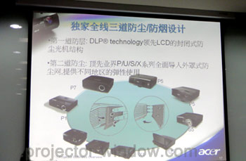防塵是行業用戶非常看重的一個性能。針對不同地區的特點和需求,宏碁提出了全線三道防塵/防煙設計。首先DLP技術所提供的封閉式防塵光機設計,為產品構筑了天然的第一道防線。其次宏碁為P/U/S/X系列全面導入外罩式防塵網,進一步建立第二道防護線,這是針對大陸地區特殊的環境和用戶需求所設計。進而,針對KTV、PUB以及一些重灰塵地區的應用,宏碁從產品內部建立第三道防塵網,直接保護色輪等精密結構免受微細粉塵的干擾和影響。