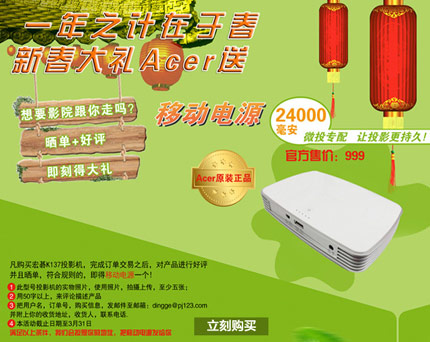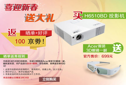 新年伊始,宏碁攜多款全新設計投影機閃亮登場,現在登錄京東商城宏碁投影機促銷頁面,參加限時曬單送好禮活動,就可領取驚喜大禮,禮品價值最高999元。活動期到2014年3月31日。