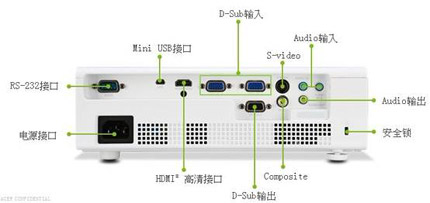 在接口方面,宏碁D222D非常豐富,除了常用的HDMI接口外,還有2組VGA,方便連接電腦、游戲機等設備,還有S-Video方便連接電視機頂盒,Audio輸入輸出接口則可以連接外置音響設備,打造自己的私人家庭影院。