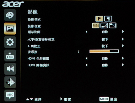 選單第二大項包含投影機架設(shè)的修正調(diào)整項目,以及清晰度和 HDMI 相關(guān)設(shè)定為主。