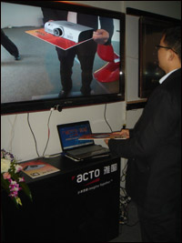 在一個大約百余英寸的水霧墻前,筆者看到水霧上正播放火焰的視頻,工作人員帶我們穿過火焰來到背后,原來投影機在后面吊裝著,這樣的投影表現還是頭次體驗,很有夢幻的感覺。接著我們又被帶到一個“人民日報閱報欄”前,這是個50多吋的液晶電視,用手在上面觸控,人民日報的各種訊息包括互聯網的沖浪就立馬產生互動。還有一個據介紹叫增強現實液晶3D顯示系統的展項也特別有趣,觀眾手里拿個卡片站在液晶電視面前,卡片上的平面圖片在電視里便適時的成了動態的立體圖像,觀眾也出現在電視里。