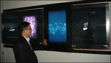 這邊的一個電視墻也讓我們開了眼界,兩個平板電視在一個互動滑軌上左右滑動,滑到不同位置,電視上就出現不同的視頻影像,讓大家感受到一個另類的電視感應,工作人員介紹,這是雅圖生產的液晶平板電視一種新的應用集成。