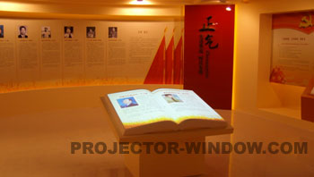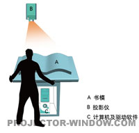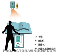 空中翻書展現在參觀者面前的是一本以雅圖LX650投影機投影方式展現的電子書,外形猶如一本打開的書籍,參觀者只需要站在書籍模型展臺前方,伸出手臂,在空中做出左右揮動手臂的動作,計算機就能識別出參觀者的動作,參觀者面前的電子書就會隨著手臂的左右揮動進行前后的翻頁,同時也可以觸摸投影畫面上設置的書簽進行查詢瀏覽。