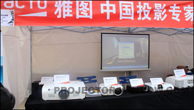 雅圖在蓮花北村中心廣場設了2個展位,現場有六位雅圖工程師為廣大市民提供專業的產品、安裝方面的咨詢服務。在這次活動中,雅圖展出了LX660、LX645W、DX120等適合家用的投影機型,還展出了適合外出娛樂使用的雅圖投影小明星S1,更有“極致科技,工程典范”之稱的LX8100。在活動現場,雅圖演示了工程機LX8100,播放了功夫熊貓、加勒比海盜等大片。在光線充足的廣場上,雅圖LX8100的表現很給力,其精彩的畫質表現,吸引了廣大市民的關注,不少小朋友深深地被影片吸引,在展位前流連忘返。