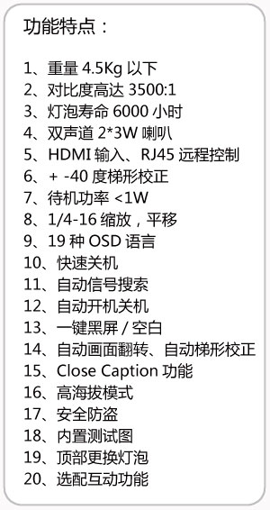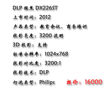 另外,雅圖DX226ST短焦投影機除了具備短焦功能外,其還加入了多種實用功能,一秒智能畫面翻轉功能,使該機可根據放置的需要,無需用戶手動調節畫面轉向,使用起來更加便捷。自動搜索信號功能,讓DX226ST能自動偵測信號來源并顯示畫面,省去手動定位的麻煩,即插即用讓您的使用變得很簡單。雅圖DX226ST短焦投影機還內置260瓦的燈泡,支持普通和經濟兩種使用模式,最高可以將燈泡的壽命延長至6000小時。同時,DX226ST短焦投影機還支持DLP