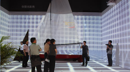 雅圖將展館劃分為“大帆船創意光影展區、雅圖建筑光影秀展區、2012年雅圖全新產品展區、文化故事墻展區、家庭影院”五個展示區域,分別展示雅圖的形象、文化、產品、愿景和雅圖強大的研發實力及雄厚的生產制造能力。在大帆船創意光影秀展區,雅圖結合帆船“雅圖號”(雅圖號參加2012年環海南島國際大帆船賽榮獲銀獎),用15臺高清高亮工程投影機、采用國際一流拼接技術組成一張高清大圖,用投影機結合視頻將拼接大圖投射向三面墻,生動、立體地勾畫出蔚藍大海的畫面,再通過地面互動投影,用智慧的方法向文博會參觀者展示了一場充滿想象的創意光影秀。