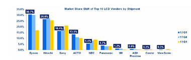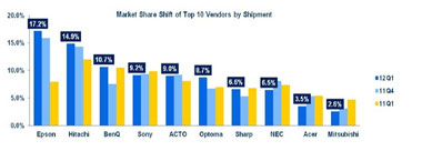 2012年第一季度雅圖投影機品牌以9.0%的市場份額,位列第五。值得一提的是,在本次的排名中,第三名、第四名、第五名之間的差距正在拉小。據(jù)IDC數(shù)據(jù)顯示,雅圖LCD機型市場份額位列第四,雅圖DLP機型市場份額位列第九;在LED銷售市場,雅圖出貨量位列第二,其中雅圖S1以516臺銷售量位居第一;十大暢銷機型中,雅圖LX211ST、LX220