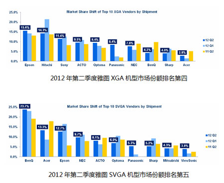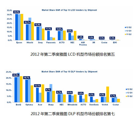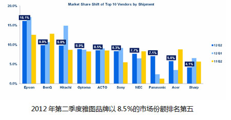 根據(jù)世界權(quán)威評(píng)級(jí)機(jī)構(gòu)IDC的排名,2012年第二季度雅圖投影機(jī)品牌以8.5%的市場(chǎng)份額,排名第五。雅圖LCD機(jī)型市場(chǎng)份額排名第五,雅圖DLP機(jī)型市場(chǎng)份額排名第七,雅圖XGA機(jī)型市場(chǎng)份額排名第四,雅圖SVGA機(jī)型市場(chǎng)份額排名第五。在出貨量前十的機(jī)型排名中,雅圖液晶長(zhǎng)焦投影機(jī)LX210、液晶短焦投影機(jī)LX211ST一同入選,分別排名第三、第五;在銷售值前十的機(jī)型排名中,雅圖工程投影機(jī)LX8100、液晶短焦投影機(jī)LX211ST分別排名第二、第五。