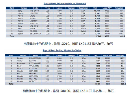 2012年第二季度,雖然市場(chǎng)競(jìng)爭(zhēng)仍然表現(xiàn)為價(jià)格競(jìng)爭(zhēng),但整個(gè)市場(chǎng)的平均價(jià)格趨勢(shì)穩(wěn)定,作為民族品牌的雅圖,始終以其渾厚的實(shí)力保持穩(wěn)步增長(zhǎng)。相對(duì)于上個(gè)季度,雅圖DLP機(jī)型、SVGA機(jī)型都有了較大幅度的增長(zhǎng),特別是在出貨量前十機(jī)型、銷售值前十機(jī)型的排名中,雅圖液晶長(zhǎng)焦投影機(jī)LX210、液晶短焦投影機(jī)LX211ST、工程投影機(jī)LX8100都取得了不俗的成績(jī)。