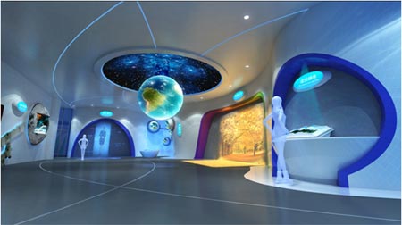 天幕與球幕展示區(qū)域主要由4臺雅圖4000流明短焦投影機、1套1.2米的球幕系統(tǒng)(含高清投影機1臺)、1套融合、1套同步軟件、1套中控系統(tǒng)、1臺22寸觸摸屏、2臺電腦組成。它通過系統(tǒng)集成天幕播放立體宇宙星空,球體由高分辨率1920X1200投影機投影地球的各種天氣,讓觀眾感受天體之浩然,同時科普天文知識。