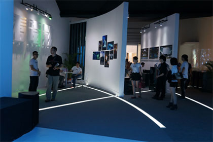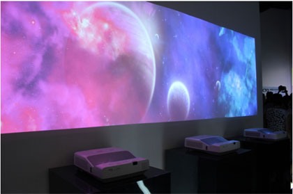 炫彩魅影展區,以6臺可在19.5厘米投出80寸畫面的雅圖超短焦投影機RAC100為載體,投出兩個4.5米寬1.2米高的視頻畫面,內容瑰麗奇幻。近年來超短焦投影的普及,已經讓用戶更進一步感受到了科學技術發展的速度,此次雅圖展示的超短焦投影機的應用,更是讓人耳目一新。 |