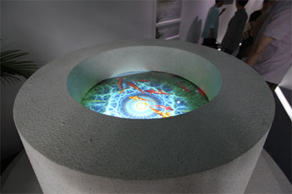 “井-俯仰”投影展區,是近年來備受用戶關注的互動投影技術與影視制作的結合,它巧妙的融入藝術理念,由清代鈕琇的哲理詩:“俯仰觀幻化、斯理本如此”演化而來,暗含中國的傳統智慧與老莊哲學,包含了對人的警醒,對世界的認知。它的外形還原井設計,以兩部短焦投影機投出上下兩個畫面,兩個畫面采用同步播放,在井內可實現感應互動,非常有趣。