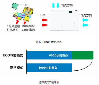 雅圖LX311投影機創新“風神”散熱系統,散熱效果提升50%,對應高海拔模式散熱,設置6組獨立散熱風扇,加強散熱效能,使用不受地域限制,以確保機器穩定運轉;經濟模式運行下,既可得到更純凈的黑色,又可延長燈泡壽命至6000小時,噪聲降低至29dB,更綠色環保。