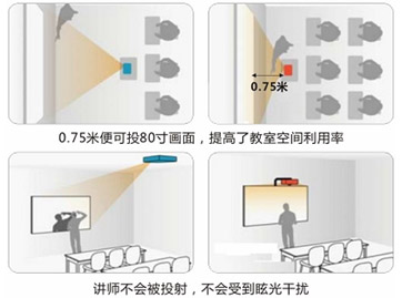 據(jù)調(diào)查報告顯示,許多教師常因在課堂授課的時候使用長焦投影機而備受困擾,長焦投影機的投射距離長,占用空間面積大,在講臺走動或者寫板書而擋住投影光線,會在幕布上產(chǎn)生許多不規(guī)則的陰影,從而影響授課質(zhì)量。