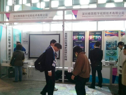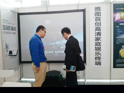 往展位里面走進(jìn)去,一塊100寸大小的銀白色專業(yè)幕布掛在墻壁上,一臺(tái)時(shí)尚黑色的投影機(jī)擺在幕布上方,兩者相距不到20厘米,這便是雅圖首創(chuàng)高清家庭娛樂終端。它可靈活根據(jù)觀看的需要,從而自主選擇投影畫面的大小,擁有超高解析度,能夠準(zhǔn)確還原圖像的表現(xiàn)色彩,而且它還能與多種設(shè)備進(jìn)行連接,無(wú)論是電腦、電視、手機(jī)、數(shù)碼相機(jī)等各種電子設(shè)備,都能切換自如,隨時(shí)隨地投影高清大屏畫面,極大程度上滿足了未來(lái)家庭對(duì)電影、電視、游戲等功能的需求,為現(xiàn)代時(shí)尚家庭用戶提供了一種新型的個(gè)性化的客廳投影方案。