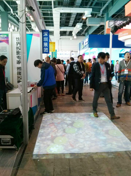 在本屆上交會(huì)上,最引人止步注視的是雅圖的互動(dòng)地面投影,使用一臺(tái)雅圖反射式超短焦投影機(jī),并將其豎立投影。利用反射式超短焦19.5里面可投射80寸畫面的特點(diǎn),在展館的過道中間為觀眾們呈現(xiàn)了高清晰度的100寸動(dòng)態(tài)畫面場(chǎng)景,2700到3200的流明亮度,還原自然絢麗的場(chǎng)景,再搭配紅外感應(yīng)裝置,使得投影畫面活了起來(lái),用腳輕輕踩在荷葉上,馬上就激蕩起陣陣漣漪,機(jī)靈的金魚們立即四處逃躲,仿佛置身于幽靜唯美的荷塘之中,吸引了大批觀眾駐足觀看,紛紛前來(lái)體驗(yàn)生動(dòng)有趣的互動(dòng)地面投影。