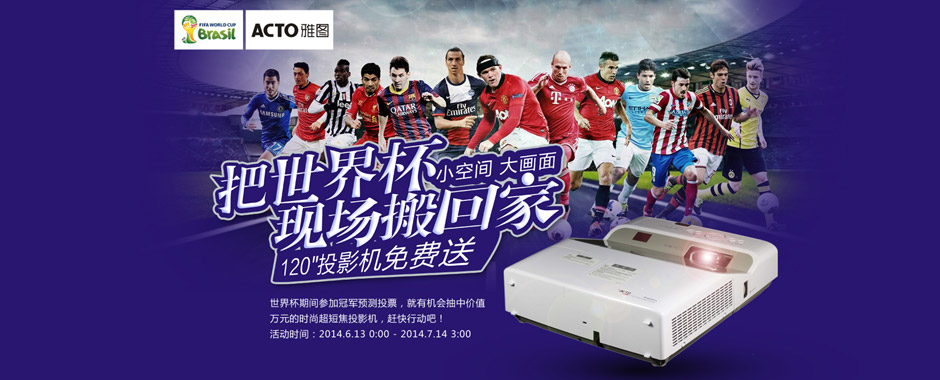 當(dāng)前鋒在高空攻勢(shì)時(shí)以強(qiáng)壯的身軀來?yè)屒颉?dāng)后衛(wèi)精準(zhǔn)凌厲搶奪對(duì)方的直傳球、當(dāng)守門員連續(xù)魚躍撲球以接住對(duì)方的射門……雅圖反射式超短焦投影機(jī)都將為你真實(shí)呈現(xiàn)這些激動(dòng)人心的瞬間。這個(gè)夏季,雅圖邀請(qǐng)您參與雅圖世界杯精彩活動(dòng),共燃綠色激情,共賞世界杯,一起為世界杯喝彩!