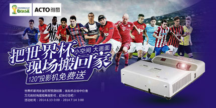 ACTO雅圖反射式超短焦投影機,開啟未來家庭視享新趨勢。趕緊拿起手機來掃一掃,關注微信號acto2014,參與世界杯冠軍競猜活動,與ACTO雅圖一起見證冠軍球隊的光榮誕生! |