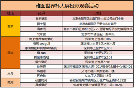 以此同時,身在北京、深圳、義烏、蕪湖這四個城市的球迷朋友可到下圖15間ACTO雅圖特選的運動酒吧里集體觀賽,享受ACTO雅圖投影機帶來小空間大畫面的切身體驗。屆時可通過手機掃描現場精心擺設的易拉寶、臺卡等物料上面的二維碼,一起參與ACTO雅圖世界杯冠軍預測活動,將價值萬元的ACTO雅圖反射式超短焦投影機搬回家。