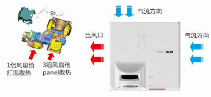 E3系列采用雅圖“風神”散熱系統,具備6組風扇。1組風扇給發熱的燈泡散熱,3組風扇給Panel散熱,加上兩組大功率排氣扇,迅速排除機體內的熱氣,平衡內部氣壓,能有效保護投影機燈泡和內部機體,延長投影機使用壽命。經過2000小時測試,普通機器老化亮度衰減35%,而雅圖投影機老化亮度僅衰減10%。 |