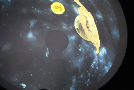 雅圖天圓地方360°穹幕影院是一個直徑7米的圓球狀,穹幕要被六臺投影機滿畫面投射,每臺投影機投影1/6球面。也就是說本來一個平面矩形的投影畫面要變形為1/6球形曲面的投影畫面,變形量十分大,曲面變形、曲面融合是這展項的一大亮點。