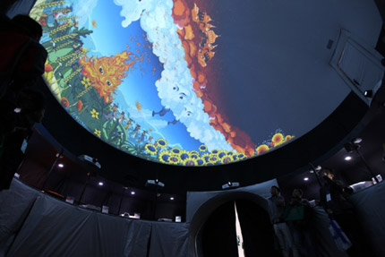 穹幕影院是寬銀幕發展到極限,轉而又向天空發展而成的一種產物。現今,雅圖卻將它賦予了更深刻的內涵,它將多通道數字多媒體投影技術、數字及光學幾何校正技術、邊緣融合技術、高清影片分布式播放技術等一系列高新技術與現代藝術完美融合。在7米直徑,周長22米球體內部,運用多臺雅圖高清工程投影機、5.1立體音響系統來實現360°雙圓周裸眼3D穹幕實現全沉浸式體驗。
