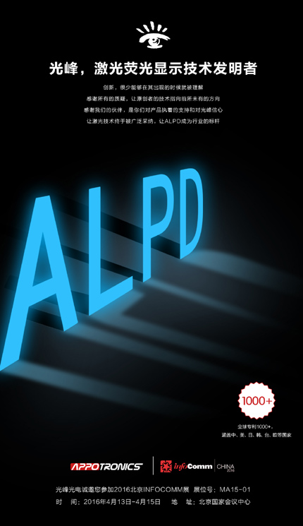 目前,ALPD激光顯示技術已成功應用在了各種高亮度的顯示產品中,如激光投影機、激光電視、數字院線、舞臺燈、大屏拼接、高端汽車照明等多個領域。2016年光峰將繼續專注于激光顯示技術研發,在激光院線、激光教育投影機、激光電視機等領域重點布局、持續發力。 |