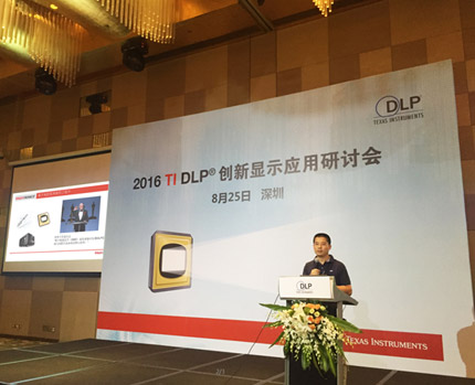 會議上,TI展示了采用DLP技術的多種創新產品,作為TI的友好合作伙伴,光峰此次在研討會上展出了業界顏色最好的單DLP激光工程投影機作為現場投影主畫面使用。同時展出的還有全球首款激光微型投影儀——小明。