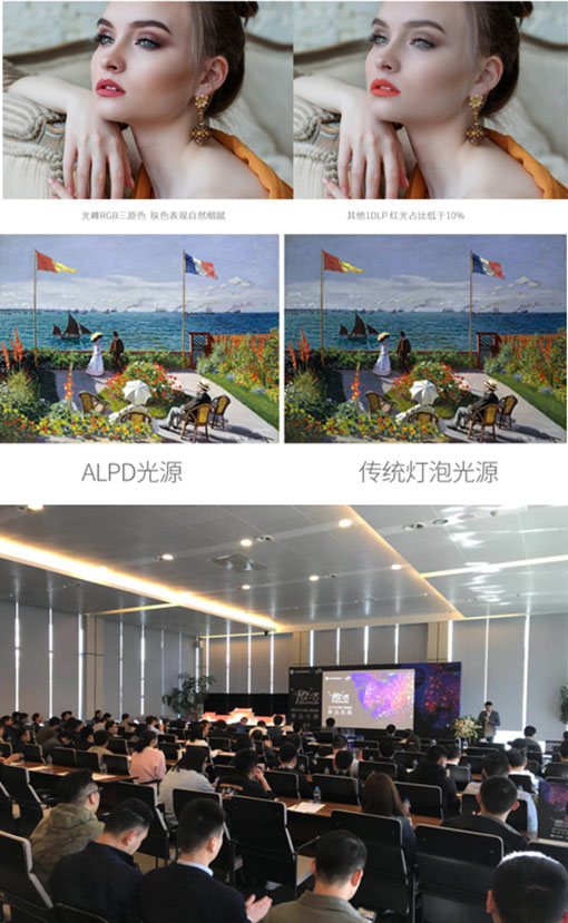 只有亮度就夠了嗎?當(dāng)然不是!在輸出亮度相同的情況下,顯示效果千差萬(wàn)別。光峰研發(fā)人員針對(duì)投影色彩表現(xiàn)力課題做了大量研究工作,本次正式推出的S系列,基于ALPD激光光源技術(shù)和RGB三段色輪體系,在色彩亮度、紅光占比、色域等技術(shù)方面表現(xiàn)優(yōu)異,全方面激活色彩表現(xiàn)力。色彩亮度是影響色彩表現(xiàn)的重要指標(biāo),色彩亮度越高的機(jī)器,在保持相同亮度時(shí),色彩表現(xiàn)越好。