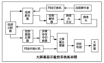 在整個監控系統中,有40多路監控信號,既可全部顯示在大屏幕上,也可單個顯示在大屏幕上,當單個顯示時,就需要將這些信號有選擇的切換到大屏幕上,如果直接操作這些切換設備,就是一項很煩瑣的工作。為此大恒顯示科技采用了美國AMX集控系統,所有那些煩瑣的切換操作都可以簡化到一個6英寸的小型彩色觸摸屏上,操作者只要"一觸即可",十分簡捷方便。如果需要擴展控制更多的設備(如,窗簾、燈光或其他紅外、串口控制設備等),只要增加相應的擴展模塊即可。