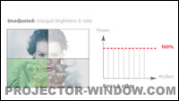 燈泡投影系統通常利用 DMD(數字微鏡裝置)芯片或光學調光器降低亮度。兩種方法都有劣勢。使用 DMD,可成功減少白色。但不能減少黑色,從而降低對比度。關閉光學調光器