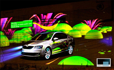 以創(chuàng)新思維著稱的汽車制造商斯柯達(dá)利用高亮度投影機制造了一場前所未有的視覺盛宴,同時也開創(chuàng)了一種全新的廣告模式——墻壁式投影映像。位于城市中心的墻壁一般是用藝術(shù)家的畫作來裝飾,但在波蘭華沙和波茲南市,斯柯達(dá)采用了全球最高亮度的40,000流明投影機和26,000投影機,進行墻壁式三維投影映像,使之變?yōu)殪`動色彩編織的高品質(zhì)畫面,彰顯未來廣告的趨勢。在項目中的難點在于,必須在視頻團隊制作內(nèi)容的同時粉刷墻壁,以確保達(dá)到最高精度,文字和圖像的投影需在固定汽車圖像和周圍達(dá)到完美的契合。即使偏差一厘米,也會影響最終效果。