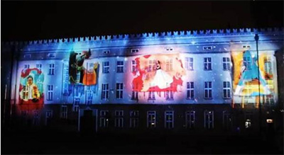 奧波萊音樂節(jié)是波蘭兩大主要音樂節(jié)之一。為慶祝音樂節(jié)50周年,奧波萊于2013年三月份舉辦了一場規(guī)模宏大的“波蘭音樂之都”音樂盛典。在奧波萊市政廳,專門設(shè)計安裝了一套奪人眼球的視頻投影全景顯示系統(tǒng),將兩臺嶄新、高亮度40,000投影機運用于3D投影全景顯示中。盛典當(dāng)天,正下著漫天大雪,極具挑戰(zhàn)性。但投影全景顯示系統(tǒng)的效果卻十分震撼:整個場景看起來更像是4D投影全景顯示。新型投影機具有超高亮度,絲毫不受風(fēng)雪影響。 |