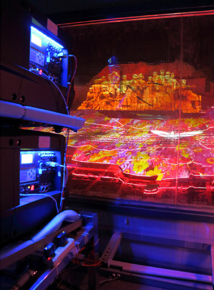《中國出了個毛澤東》戶外實景秀總共部署了42臺巴可2.2萬流明投影機通過沈陽四維數碼科技有限公司完成的整體視覺顯示方案,在一款可拆卸的巨幅中國地圖舞臺,以及舞臺后面的實景山壁上,投射出整個演出的高清背景畫面,總投影面積達到6,000平米,成為國內最大戶外實景投影秀。該項目還引領了“舞美仿真”的創新應用。