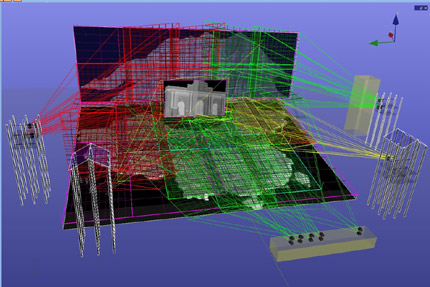 CAD軟件對整個場景的構造和光環境進行建模分析,確定了投影機的精確布局點,通過電腦模擬快速分析出不同安裝方式對最終投影面亮度的影響,同時還可計算出進入觀眾眼睛光線的亮度和分辨率,給出改進方案,巴可幾十年的視頻經驗為整個演出的成功保駕護航。