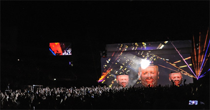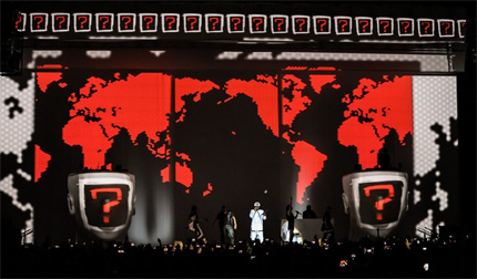 舞臺背景設計新穎復雜,三個大型充氣式頭像成為舞臺最引人矚目的亮點,頭像主要用于呈現will.i.am的面部畫面,保持頭像嘴型與歌聲的同步。三個頭像上各有一位DJ。此外,還有三幅下拉式投影屏幕。如何確保270度投影完全映射而沒有任何陰影,是整個設計執行所面臨的挑戰,這需要每臺投影機在各個場地上的定位精確,并且每臺機器都要擁有專門的視頻輸入。