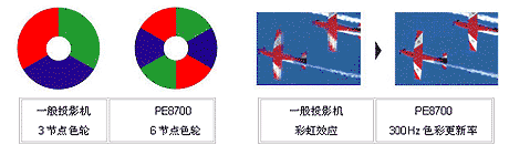 采用6節點色輪,以5倍速旋轉,提供PE8700世界最快的300Hz超高速色彩更新率,使色澤自然飽和,并有效消除彩虹效應。