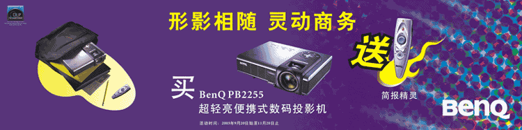 但是受制于投影機操作的限制,有時候,演講者不得不遷就電腦的擺放位置,或者需要請助手配合著切換簡報。失去利落的專業形象,令商務精英們苦惱不已。05年9月20日起至11月20日止,BenQ投影機家族為廣大商務精英們推出“靈動商務解決方案”。只需購買BenQ超輕亮便攜式投影機PB2255,即可免費獲得一個“簡報精靈”,商務生活如虎添翼,再現無限利落風采。