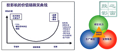 若畫出一根微笑曲線,無疑在價值鏈的兩端所能產(chǎn)生的附加價值最高。在曲線左端,BenQ扮演了投影機原廠的角色,不但透過上下游整合擁有關(guān)鍵零組件的優(yōu)勢,同時在核心技術(shù)的研發(fā)、產(chǎn)品的造型設(shè)計,以及大量生產(chǎn)制造方面具有強大的實力。而微笑曲線的右端,則仰賴經(jīng)銷伙伴與通路的配合與支持。反之,他們又可借助BenQ強勢的品牌資源,整合供應(yīng)鏈管理與完善而又周到的客戶服務(wù),發(fā)揮行銷渠道最大的附加價值。牢牢掌握供應(yīng)鏈的兩端,也就抓住了最容易產(chǎn)生價值以及價值最大化的關(guān)鍵部分。BenQ投影機意欲在兩年內(nèi)成功沖刺市場第一,唯有在原先不錯的基礎(chǔ)上繼續(xù)強化核心競爭能力。