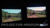 BenQ PE8720、PE7700高端家用投影機視聽鑒賞會現場擺設了兩塊OS-G100 WF202 100英寸地拉幕,分別投射了一臺BenQ PE7700和一臺SANYO PLV-Z4做投影比較演示,而視頻源則采用兩臺HTPC分別連接但播放同樣的1080i和720p電影片斷,首先播放的是1080i“超人總動員”的一段室內環境的家庭爭吵戲,人物的表情和特寫時的細節表現是重點,BenQ PE7700的畫面更偏向暖色調,色彩更濃郁,更符合這部動畫電影畫面“偏紅色”風格,而SANYO PLV-Z4的畫面則更清淡,平面感更強。