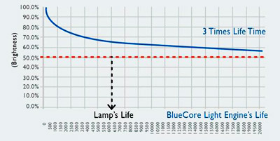 眾所周知,傳統(tǒng)光源的投影機采用高壓汞燈或稀有氣體燈泡,燈泡在發(fā)光的同時伴隨大量的熱量釋放,長期使用后,燈泡的壽命和熱衰減一直被廣大用戶在詬病的問題。LX60ST/LW61ST采用的藍核光引擎運用高亮藍色激光二極管模組取代了傳統(tǒng)的熱燈泡光源,激光模組的光效率遠遠高于傳統(tǒng)燈泡,且發(fā)熱量很少,這樣光源模組的壽命也得到突破性的提升。LX60ST/LW61ST可提供10000/20000小時(標準/節(jié)能)的光源壽命,而且在長期的使用中,激光模組亮度的衰減遠慢于普通熱燈泡,約合傳統(tǒng)光源2-3倍,可避免更換燈泡的麻煩,降低用戶的平均使用成本。