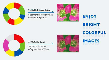 目前,主流的DLP光引擎一般采用6段式色輪分色處理,LX60ST/LW61ST采用的藍核光引擎創(chuàng)新的使用了8段式色輪,在傳統(tǒng)紅綠藍三原色分色方法的基礎(chǔ)上再造了一個黃色,正是因為新色輪及激光光源的運用,藍核光引擎可將藍色色彩亮度大大提高,與此同時,以往DLP投影機難以完美演繹的黃色部分也變得鮮艷動人。再加上80000:1的超高對比度,整體可實現(xiàn)畫面艷麗,色彩豐富,層次分明的投影效果。商教用戶擁有了這臺投影機,意味著不僅可以得到傳統(tǒng)DLP投影機清晰銳利的細節(jié)顯示,同時還擁有了不遜于LCD投影機的艷麗色彩,可謂是博采眾長,技壓群芳。