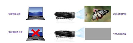 Eco技術(shù)的投影機(jī)后,投影機(jī)會(huì)根據(jù)當(dāng)前的輸入信號(hào)狀態(tài),并自主的調(diào)節(jié)燈泡功耗,從而實(shí)現(xiàn)大幅度節(jié)能和延長(zhǎng)燈泡壽命的效果。具體說(shuō)來(lái):
