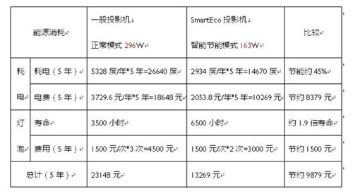 從表中可以看到,該企業(yè)在運(yùn)用了節(jié)能投影機(jī)后,5年可總共節(jié)能費(fèi)用約9879元,這個(gè)價(jià)格幾乎可以再購(gòu)買2-3臺(tái)投影機(jī);不僅如此,節(jié)約能源降低的碳排放還對(duì)全球的環(huán)境改善也貢獻(xiàn)了微薄之力,若千千萬(wàn)萬(wàn)的企業(yè)都采用節(jié)能管理的模式來(lái)審核企業(yè)的OA能源消耗,這對(duì)降低全球石化能源消耗,實(shí)行可持續(xù)發(fā)展將會(huì)有非常實(shí)際的意義。