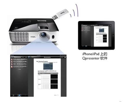 文檔如word/PPT/EXCEL等都可以直接選擇保存成PDF格式,支持PDF直讀,便意味著消費者可以真正的做到便攜的無PC投影,演講者只需將需要播放的文檔轉換成PDF格式放入U盤,MX662就可以通過USB直接讀取和播放出來,讓使用者省去設備連接時間,擺脫對傳統(tǒng)PC的束縛。另外,消費者只需要選配一只明基無線模塊插在USB接口上,即可將MX662升級成為一只無線投影機,使用者只需要用電腦通過WIFI和投影機連接便可將圖像和音頻文件傳輸給投影機,十分便捷;和市場上同類產品不同的是,明基MX662的USB無線投影功能更是支持風行的蘋果設備,用戶只需在蘋果應用商店中免費下載安裝Qprestion程序,便可將IPhone或者IPad中的文檔或視頻通過無線傳輸至投影機,將手中咫尺的畫面變成40-300英寸的巨大畫面,將內容與觀眾分享。