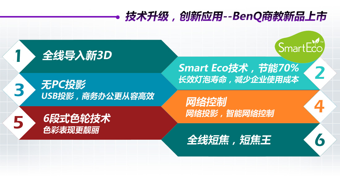 面向2013年,BenQ推出了豐富、強大的投影機產(chǎn)品線,以“創(chuàng)新應用”為核心理念,BenQ正在打造專為滿足用戶細致、個性化需求的投影機,特別是在商教領域。BenQ從用戶角度出發(fā),致力于完成從“技術升級”到“應用升級”的跨越,將多種人性化的功能,融合注重體驗的設計理念,打造出不僅性能領先,還能夠真正令用戶感受到魅力的產(chǎn)品。BenQ努力成就創(chuàng)新應用的領航者,引領商教投影領域的發(fā)展風潮。 |