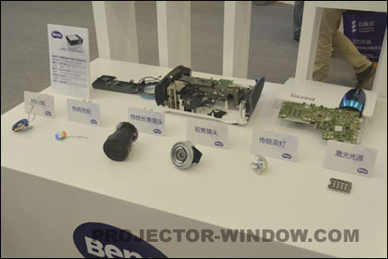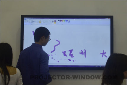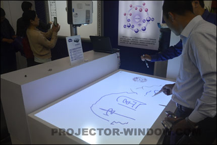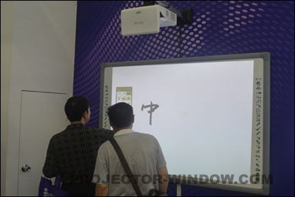 武漢教育展會現場使用了桌面互動投影這一新穎的互動模式來展現最新的MW820ST互動短焦投影機的超凡魅力,小巧精致的MW820ST白色機身和金屬質感強烈的原裝吊架相得益彰,通過垂直安裝的方式釘在定制的互動桌體上,通過電源/HDMI和USB線即可搭建出一套非常簡潔易用的互動系統。使用者可以用隨配的互動筆在桌面進行書寫、標準、點擊、拖拽等等操作,甚至試用者玩起了瘋狂的小鳥游戲,試想在一個70寸的桌面上玩互動游戲是多么的震撼。光學部分來看,MW820ST標稱亮度為3000流明,采用了一顆大尺寸魚眼短焦鏡頭,可在1米的距離投射出95英寸的巨大畫面,由于采用了0.62英寸的WXGA成像芯片,畫質清晰銳利,顯示內容比普通XGA多了30%以上;作為專業的教育投影機,MW820ST在投影機相對脆弱的色輪傳感器部分加了特別的風路阻斷機構,以降低散熱氣流中粉塵對傳感器的侵蝕,同時原裝標配的防塵濾網,可滿足中國北方區域對投影機抗粉塵性能的要求。 |